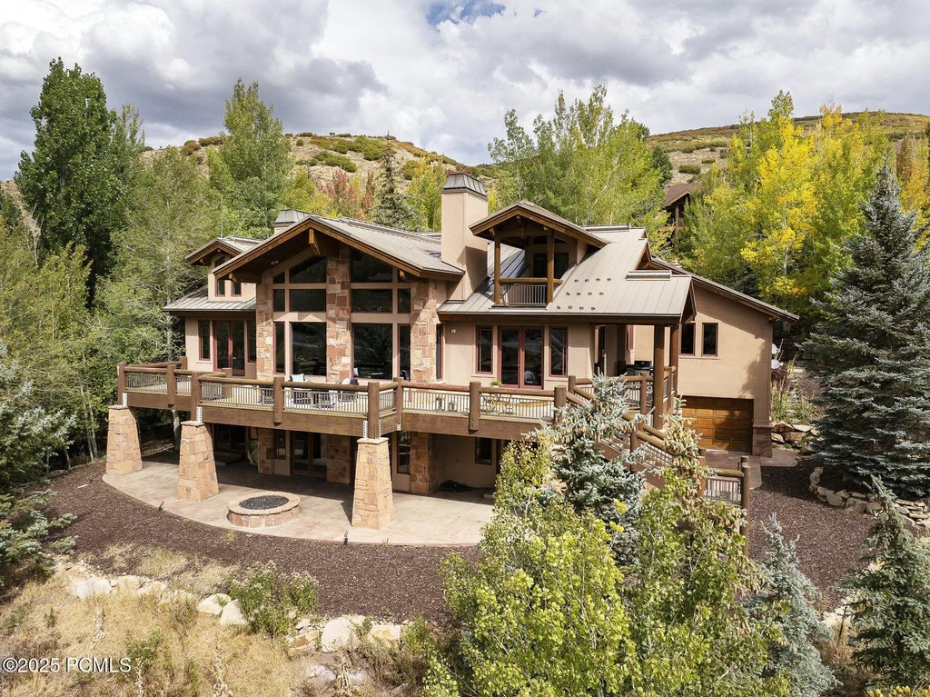 Perched above the 8th green of Jeremy Ranch Golf Club, this mountain home blends timber frame design with modern comfort, all set against the backdrop of year-round beauty. Mature aspen trees surround the property, offering a true sense of privacy and the perfect canvas for all four seasons. From the expansive wood deck with hand-crafted timber railings to the cozy fire pit and private hot tub, every detail invites you to relax and take in the sweeping golf course and mountain views. Inside you find soaring ceilings, tons of natural light, and an open floor plan that flows well. The heart of the home centers on a dramatic double-sided fireplace and a chef's kitchen with a granite island designed for gathering. The main-level master suite is its own sanctuary with a private fireplace, spa-style bathroom featuring a soaking tub and walk-in shower, dual vanities, and a generous walk-in closet. An office upstairs offers even higher views for work or creativity. Downstairs, a full second kitchen and family room with a fireplace provide the perfect space for entertaining, extended family, or guests. Each of the four bedrooms has its own private bath, including Jack-and-Jill bedrooms on the lower level and a separate en suite. Additional highlights include a workout room, basement garage and workshop. Every convenience has been considered: a porte-cochere, heated garages, dual laundry rooms (with gas and electric hookups), central vacuum, soft water system, and zoned hot water heating. Whether hosting summer evenings on the deck, watching the first snowfall from the hot tub, or gathering around the fire after a day on the slopes, this home offers the perfect balance of mountain living and luxury. Jeremy Ranch combines the serenity of the Wasatch mountains with quick access to both Park City and Salt Lake City.